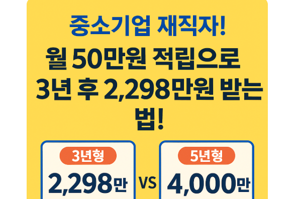 중소기업 재직자라면 놓치면 안 될 대박 혜택이 출시됐습니다! 월 50만원 적립하면 3년 후 2,298만원, 5년 후 3,980만원을 받을 수 있는데 아직 모르는 분들이 너무 많습니다. 지금 바로 신청 자격부터 확인해보세요.